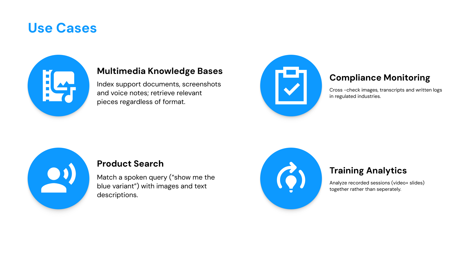 - Search across formats (“Find me slides, videos mentioning Product X”)