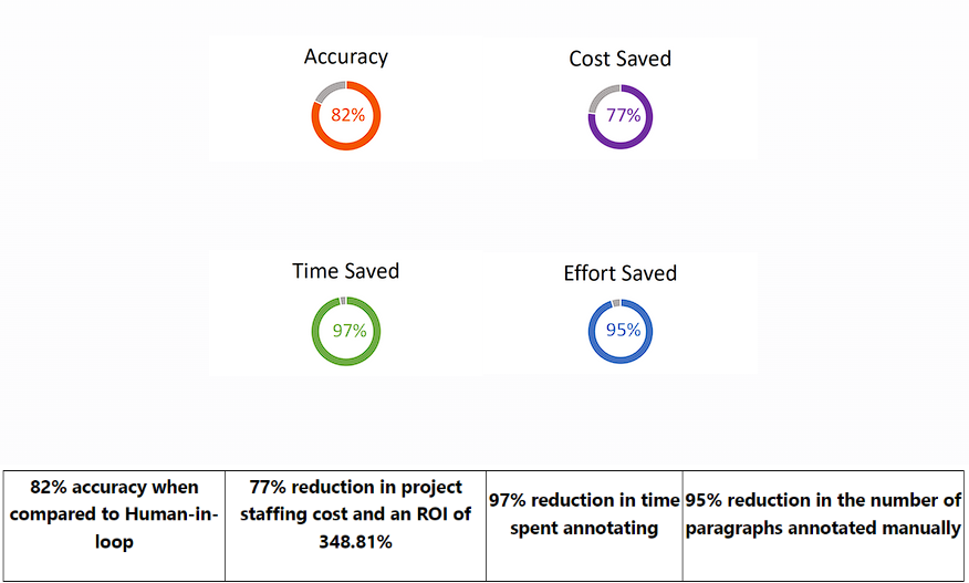 The Annotation cost for the in-house data team is $1320 and for the Data-Science team, it is around $1405. Therefore, the total cost is $2725. The cost for annotating 477 paragraphs using the DataNeuron ALP is around $607.3. In this case, the reduction in cost is 77.71%, which is very significant with a cost ROI of 348.81%.