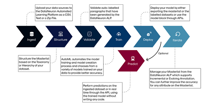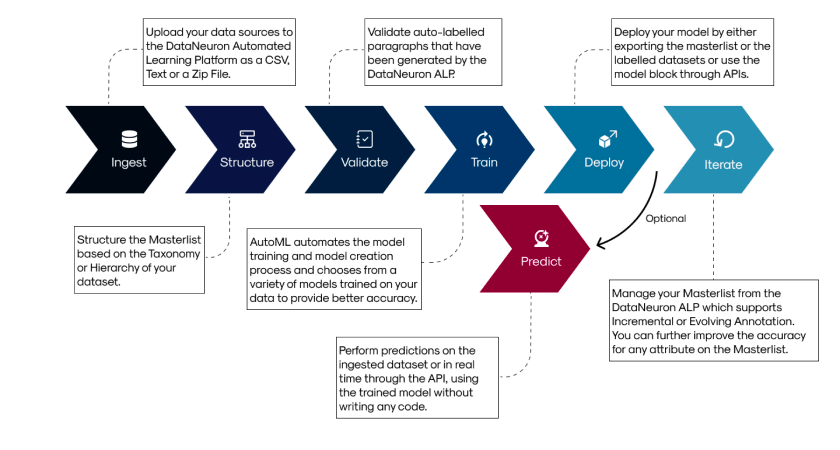 This is the DataNeuron Pipeline. Ingest, Structure, Validate, Train, Predict, Deploy and Iterate.