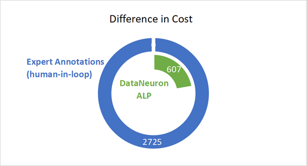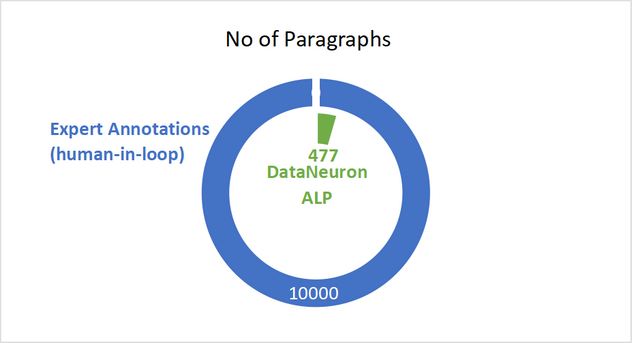 The number of paragraphs that needs to be annotated when using the DataNeuron ALP is 659 since most of the paragraphs which did not belong to any of 8 classes were discarded using context-based filtering. The cost for annotating 659 paragraphs using the DataNeuron ALP is $575.