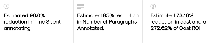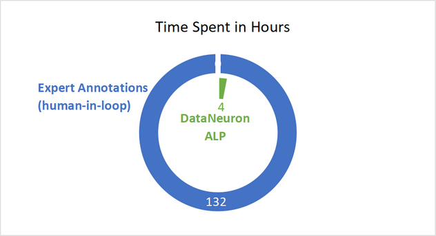Based on this, it would take an estimate of 17.25 hours for the users to validate 2069 paragraphs provided by the DataNeuron ALP. When compared to the 173 hours it would take for an in-house team to complete the annotation process, DataNeuron offers a staggering 90% reduction in time spent.
