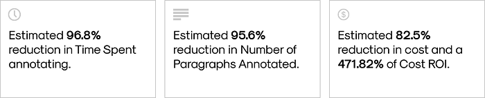 Based on this, it would take an estimate of 6 hours for the users to validate 659 paragraphs provided by the DataNeuron ALP. When compared to the 188 hours it would take for an in-house team to complete the annotation process, DataNeuron offers a staggering 96.8% reduction in time spent.